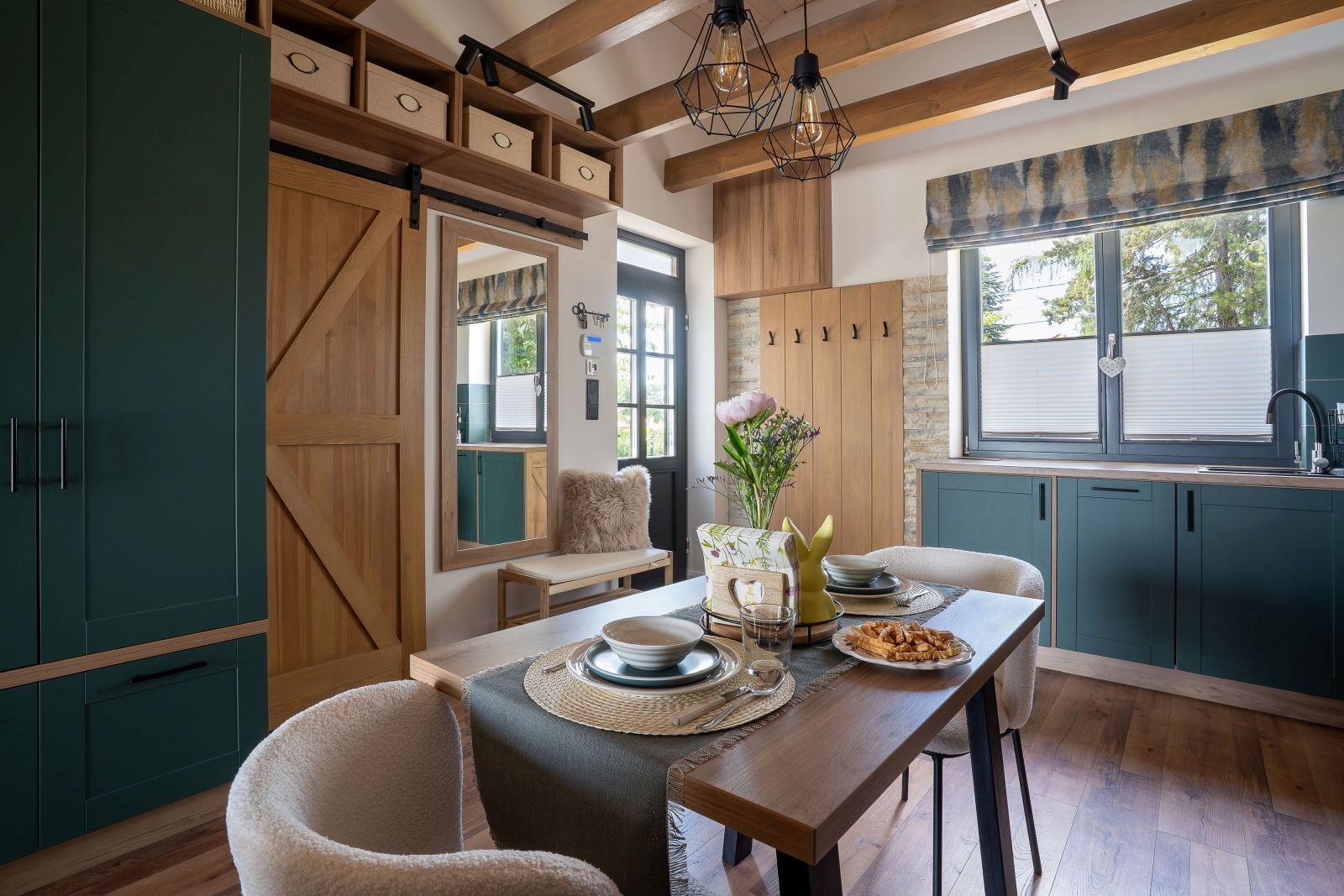 A berendezésnél a minőség, a természetközeliség, és a gondosan kiválasztott részletek kapták a főszerepet: fa hatású felületek, pajtaajtó, puha textíliák, hangulatos fények és kandalló teszik meghitté és otthonossá a teret. A felszerelt konyha ideális helyszín a közös főzésekhez.